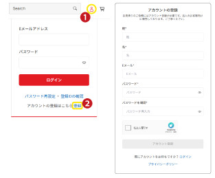 またはサイトのトップページからもお手続きできます。 Webサイト右上のアカウントボタンをクリック